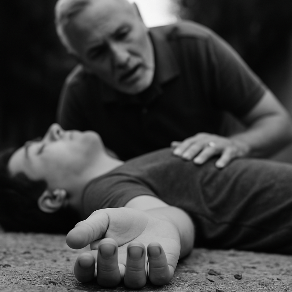 Todo cesó. Dejé de sufrir, de pelear por aire, de pelear con mi corazón acelerado. Todo cesó. Se apagó, Off. Y dos eternidades después se me concedió volver. Volví porque una voz me gritaba, asustada: Tranquilo Joelito, Tranquilo, abre los ojos, abre los ojos…. Y una mano tallaba mi esternón. Fue un fade in lento… de negros al rostro de mi papá. Esa voz que me gritaba y me decía tranquilo hijo, llegó poco a poco, como de un lugar muy lejano y se hizo más fuerte. Y abrí los ojos. Confundido. Miré a mi papá. Le dije: no sé qué le dije carajo. Algo le dije. Yo, en el piso del estacionamiento, sucio, lleno de tierra. Y ahora habían personas a mi alrededor. Varias personas que no conocía haciendo preguntas: Necesita una ambulancia señor? ¿Cómo está él, ya reaccionó? NECESITA UNA AMBULANCIA?? Apremiaban las voces. Gente que n conozco que ya nos rodeaban. Asustados. El vecino aquí tambien, ya estaba mi mamá aquí tambien, la lado de mi, entre la gente. ¿Cuánto tiempo estuve OFF? Esto no fue normal, no fue un momentito. Dio tiempo que le avisaran a mi mamá, que estaba en la casa y viniera hasta acá. Dio tiempo de eso. Fueron más de 4 minutos dijo mi papá después.