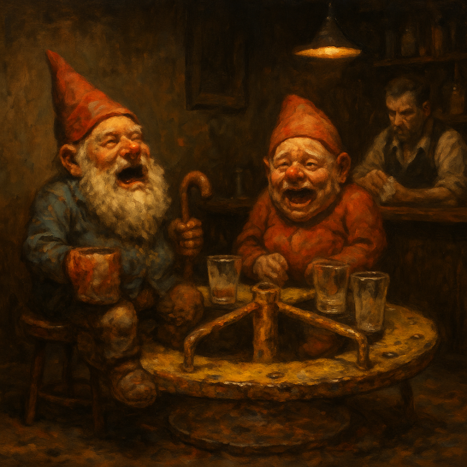A su lado, el otro gnomo, el de la espalda abultada y las piernas inciertas, sigue atrapado en el mismo bucle: repite las mismas bromas cien veces, con la risa boba de quien cree inventar el mundo en cada repetición. Cada eco suyo es celebrado por el bastón como si fuera revelación divina, y así giran juntos, como un carrusel oxidado que nunca se detiene.